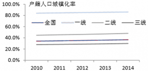 2014 年全國僅 9 個省直轄市戶籍城鎮化率超過 45%,剩余省市以三線城市為主