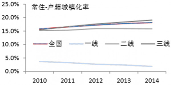當前僅一線城市常住與戶籍城鎮化率差距在縮小