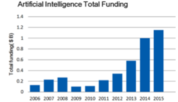 據(jù)權(quán)威機(jī)構(gòu) Venture Scanner 的統(tǒng)計(jì),2014 年全球人工智能領(lǐng)域投資額為 10 億美元,同比增長近 50%,2015 繼續(xù)增長至 12 億美元。2014 年全球人工智能領(lǐng)域,風(fēng)投 方面共完成 40 筆交易,總金額高達(dá) 3.09 億美元,同比增加 302%。2006-2015 年全球人工智能領(lǐng)域投資總額(十億美金)