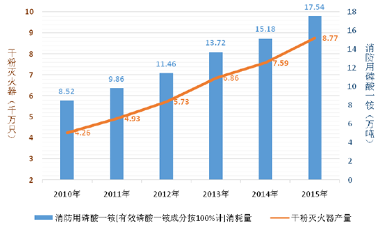 2010-2015年中國干粉滅火器產(chǎn)量及消防用磷酸一銨消耗量推算