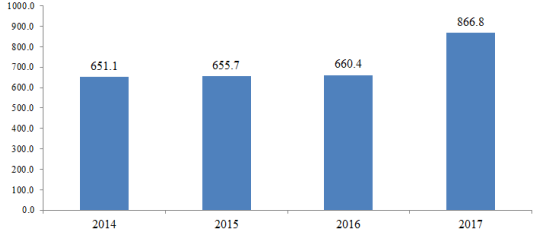 2014-2017 年全球醫療設備電源規模預測 (單位:百萬美元)