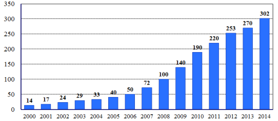2000-2014 年中國 LED 全彩顯示屏市場規模 (單位:億美元)