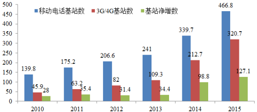近年來,我國通信行業投資增長迅速,隨著移動互聯網、云計算等新興技術的使用,我國通信設備市場快速發展。隨著 3G 網絡、 4G 網絡的投資建設、中國鐵塔公司的組建,我國移動通信基站數量快速增長。據工信部數據, 2015年,新增移動通信基站 127.1 萬個,是上年凈增數的 1.3 倍,總數達 466.8 萬個,其中 4G 基站新增 92.2 萬個,總數達到 177.1 萬個。 2010-2015 年移動電話基站發展情況如下: