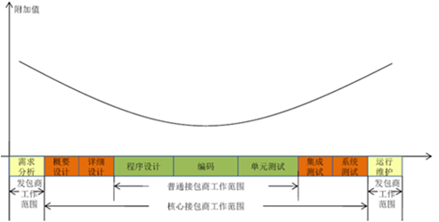 軟件外包業(yè)務(wù)鏈主要包括需求分析、概要設(shè)計(jì)、詳細(xì)設(shè)計(jì)、程序設(shè)計(jì)、編碼、單元測試、集成測試、系統(tǒng)測試、運(yùn)行維護(hù)等多個(gè)環(huán)節(jié)。其中,程序設(shè)計(jì)、編碼和單元測試是附加值相對較低的環(huán)節(jié),通常由普通一級(jí)或二級(jí)軟件接包商完成,國內(nèi)多數(shù)接包商的業(yè)務(wù)范圍均集中于上述環(huán)節(jié);概要設(shè)計(jì)、詳細(xì)設(shè)計(jì)、集成測試和系統(tǒng)測試附加值相對較高,通常由規(guī)模較大、技術(shù)水平較高的核心一級(jí)接包商完成,國內(nèi)大型接包商的業(yè)務(wù)范圍可延伸至上述環(huán)節(jié);處于業(yè)務(wù)鏈兩端的需求分析和運(yùn)行維護(hù)環(huán)節(jié)附加值最高,由于需要與最終客戶多次交流或在客戶現(xiàn)場進(jìn)行,通常由國際發(fā)包商或IT 咨詢公司完成,國內(nèi)接包商通常難以觸及上述業(yè)務(wù)環(huán)節(jié)。