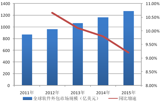 2015 年,全球軟件外包市場規(guī)模達(dá)到1,267.8 億美元,同比2014 年增長9.2%。
