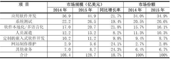 現(xiàn)階段,國內(nèi)軟件外包業(yè)務(wù)的服務(wù)內(nèi)容主要包括應(yīng)用軟件開發(fā)、定制的嵌入式軟件開發(fā)、系統(tǒng)測試、人員派遣、網(wǎng)站制作維護(hù)和軟件本地化(多語言化)等。其中,應(yīng)用軟件開發(fā)為軟件外包市場中規(guī)模最大的業(yè)務(wù)領(lǐng)域,2015 年應(yīng)用軟件開發(fā)市場規(guī)模為44.9 億美元,占軟件外包市場的份額為34.9%。