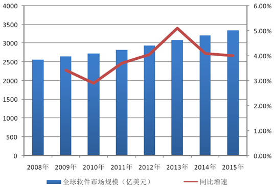 近年來(lái),全球經(jīng)濟(jì)形勢(shì)整體低迷,但軟件和信息技術(shù)服務(wù)的市場(chǎng)需求仍穩(wěn)步增長(zhǎng)。2015 年全球軟件市場(chǎng)規(guī)模達(dá)到3,336.68 億美元,2008 年至2015 年,全球軟件市場(chǎng)規(guī)模的年均復(fù)合增長(zhǎng)率為3.89%,整體表現(xiàn)優(yōu)于宏觀經(jīng)濟(jì)。