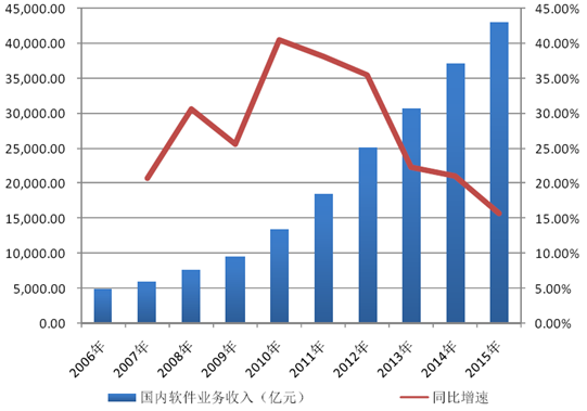 近年來(lái),我國(guó)軟件和信息技術(shù)服務(wù)業(yè)持續(xù)快速發(fā)展,2015 年行業(yè)收入規(guī)模達(dá)到42,847.92 億元,較2006 年行業(yè)收入規(guī)模增長(zhǎng)7.92 倍,年均復(fù)合增長(zhǎng)率達(dá)到27.53%。自2013 年起,隨著我國(guó)宏觀經(jīng)濟(jì)增速整體放緩,軟件和信息技術(shù)服務(wù)業(yè)的規(guī)模增速較2010 年至2012 年的峰值水平有所下降,但年均增速仍保持在15%以上。