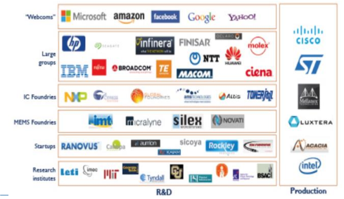 國外 100G 的硅光傳輸領域不斷取得技術突破, 廠商紛紛卡位產業(yè)鏈關鍵環(huán)節(jié) 。自 2014年起100G硅光子領域的國外廠商不斷取得技術突破,紛紛拿出了自己的100G產品。目前Intel、IBM、Luxtera、Kotura 等是目前國際上從事硅光子研究的主要公司,光器件廠商,系統(tǒng)設備廠商也紛紛布局硅光子行業(yè)。在該領域較為領先的美國已經在 2015 年實現了相關產品在電信市場上的銷售,并且已有硅光子創(chuàng)業(yè)公司成功 IPO。