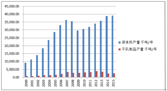 我國 2000 年-2015 年液體奶和干乳制品產量