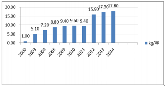 我國乳制品消費量總體呈現增長的趨勢,雖然增幅不是很大,但可以看出,乳制品已逐漸成為人們日常消費不可缺少的食品。2010 年,我國人均液體奶消費為 9.6kg,2014 年為 17.8kg,較 2010 年增張 85%,但我國相比較發達國家還有很大差距, 其還有很大的增長空間。 中國的人口基數比較大, 人均消費又很低,因此市場前景非常大。這也是全球乳品企業看好中國奶業市場,不斷進軍中國的一個重要原因。