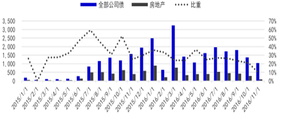 今年年初由于債市行情較好,加之地產企業對資金的需求高漲,公司債發行規模大幅增長,其中房地產行業公司債占比較高。下半年受公司債發行監管趨嚴影響,公司債發行規模受到較大沖擊,特別是10月底滬深兩市發布的《關于試行房地產、產能過剩行業公司債券分類監管的函》,直接影響了公司債的發行規模。