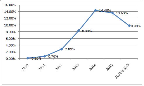 2011 年-2016 年市場成交額(億元)及傭金率(%)