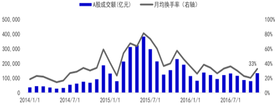 2016年以來A股市場較為低迷,市場以震蕩為主,兩市成交量大幅下滑,因而經紀業務受到較大影響。今年以來,兩市日均成交額為5,260億元。從月度數據來看,11月的成交量和換手率有上升趨勢,但全年交易量與去年相比將下滑50%左右。預計2017年全年A股市場日均成交額大約為6500億。