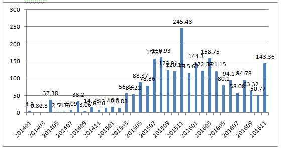 從具體數據來看,新三板掛牌公司今年5月-10月通過定增的融資規模均不足100億元,11月新三板融資規模突破100億元,達到143.35億元,2016年新三板再融資規模低于2015年。存量上升加上行情回暖,預計2017年新三板再融資規模將小幅回升。