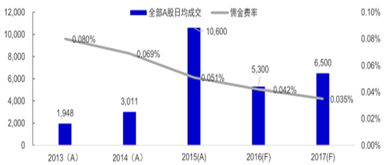 互聯網金融對傳統經紀業務的滲透,使得小券商有了彎道超車的機會,但也加速了傭金率的下滑。2013年的傭金費率為0.080%,2014年下降至0.069%。2015年進一步下降至0.051%。認為,2016年傭金率水平將進一步下降至0.042%,預計2017年平均水平為0.035%。