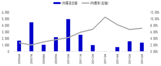 股權業務承銷方面,2015年IPO重啟,對券商投行業務構成利好。從規模來看,IPO增長較為穩定,在目前監管層對IPO較為謹慎的態度下,整體規模增速不會過快,較為穩定。手續費率方面,2015年以來手續費率處于上升態勢,2016年至今的手續費率水平僅落后于2013年和2014年。預計2017年IPO對券商投行業務收入的貢獻度與2016年相當。