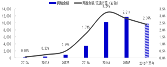 目前兩融余額占A股市場流通市值比重約為2.39%,認為2016年該比重將在2.5%,按照2017年流通市值44萬億元估計,對應日均兩融余額為1.1億元。