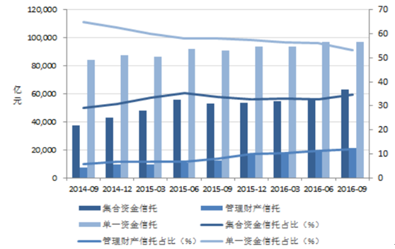 信托資產余額按信托業務占比(2014.09-2016.09 )