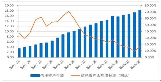 2011-2016年中國信托資產規模及增速(單位:萬億元)