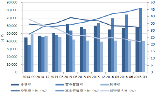 2013 年 3 季度以來,融資類信托經歷了一次快速下降的過程,這正是信托公司推動行業轉型發展的表現。融資、投資、事務管理類業務結構曾經是信托業務的“三分天下”格局,緊縮銀信合作資產規模之后,銀監會開始強調信托公司不僅僅只是作為一個融資的通道,要鼓勵信托公司業務轉型,積極倡導信托公司加大主動管理類信托產品的開發,培育核心資產管理水平和自主理財能力;因此,信托產品開始從融資類向主動管理類轉變。到 2016 年 3 季度末,融資類信托規模為 4.02 萬億元,占比 22.11%;投資類信托規模為 5.85 萬億元,占比 32.19%;事務管理類信托規模為 8.30 萬億元,占比 45.71%。投資類信托占比較為穩定,事物管理類信托占比上升。投資類和事務管理類信托成為信托業務發展的兩大驅動力量。