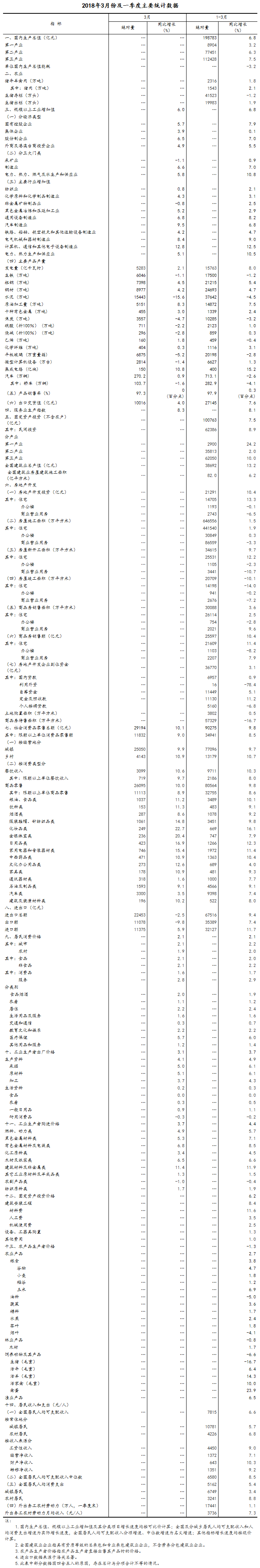 (2)根據季節調整模型自動修正結果,對近一年來各期國內生產總值、規模以上工業增加值、固定資產投資(不含農戶)、社會消費品零售總額環比增速進行修訂。修訂結果及2018年一季度GDP環比數據、3月份其他指標環比數據如下:
