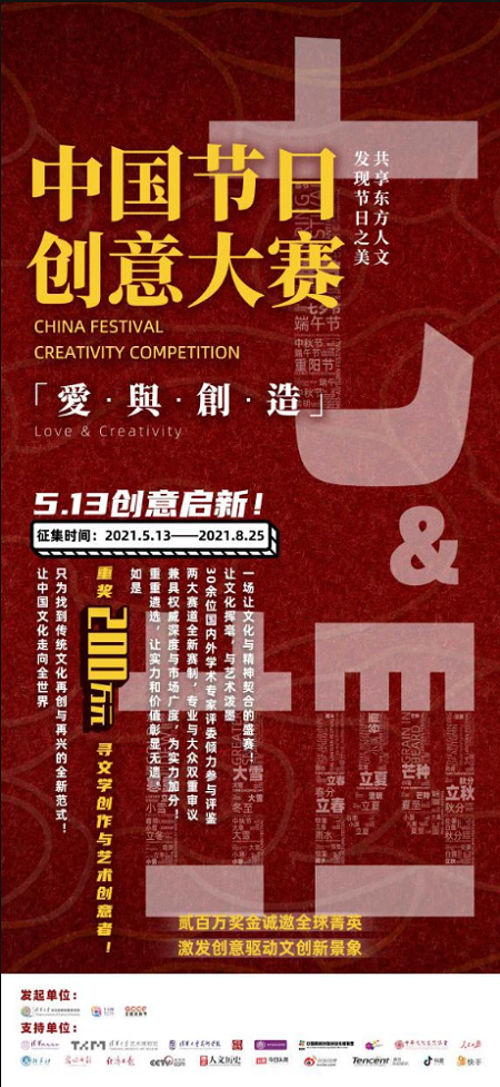 核心提示:中國節日和節氣是中華優秀傳統文化的代表,其蘊含的人文內涵已成為中國文化的符號和載體。為將傳統節日、節氣這一承載國家歷史,民族價值觀的精神文化進一步推廣發揚中國節日和節氣是中華優秀傳統文化的代表,其蘊含的人文內涵已成為中國文化的符號和載體。為將傳統節日、節氣這一承載國家歷史,民族價值觀的精神文化進一步推廣發揚,2021年5月13日,由清華大學文化創意發展研究院發起,社會各界鼎力支持的「全球文創節-中國節日創意大賽」正式開啟!