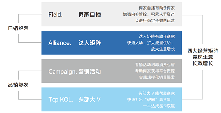 整體來說,商家自播 (Field) 和達(dá)人矩陣 (Alliance) 用于構(gòu)建穩(wěn)定的日常銷量,而營(yíng)銷活動(dòng) (Campaign) 和頭部大V (Top KOL) 用于實(shí)現(xiàn)規(guī);钠蜂N爆發(fā)。商家可以基于不同階段的GMV增長(zhǎng)需求,靈活分配四大經(jīng)營(yíng)陣地的運(yùn)營(yíng)資源與營(yíng)銷投入,實(shí)現(xiàn)抖音電商生意總量穩(wěn)定、高效的持續(xù)增長(zhǎng)。