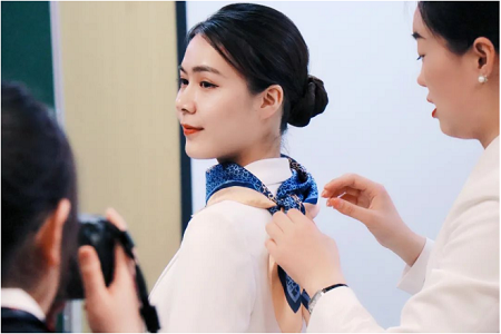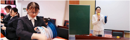 東方禮儀研究院團隊老師余丹現場演示教師絲巾的打法和場合應用。