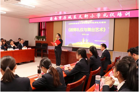 東方禮儀研究院團隊老師統一身穿白色套裝,為山東省濟南市義軒小學全體教師帶來《教師禮儀與教師形象管理》培訓課程