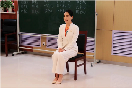 東方禮儀研究院團隊老師余丹現場演示教師集中場合的坐姿