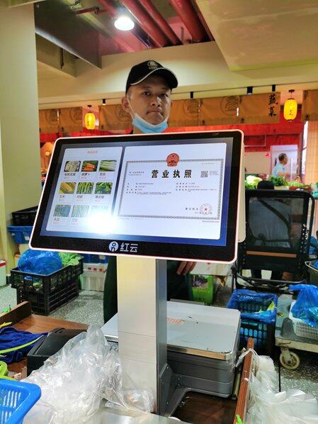 對(duì)于大眾普遍關(guān)心的食品安全問題,蘇州壹號(hào)菜市場(chǎng)也非常重視。進(jìn)入壹號(hào)菜市場(chǎng),可以看到每一個(gè)檔口都配備有客如云智能收銀機(jī),收銀機(jī)副屏上展示每家商戶的營業(yè)執(zhí)照,配合市場(chǎng)監(jiān)管局做好亮證亮照經(jīng)營。