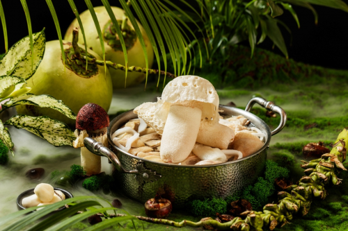本季的椰椰新寵,則是“大”有來“頭”!從海南到貴州,四季椰林椰子雞火鍋穿越地圖尋味到了不可多得的珍稀美味!竹笙皇后,來自于貴州,滋味鮮美,肉厚鮮脆,爽口到爆,其營養價值也及其豐富,有滋陰養血、益氣補腦、止咳化痰及減少脂肪積儲的功效,有“菌中皇后”之稱, 因其獨特的生長環境,一年只生長一季,是難得一品的山間限量美食!