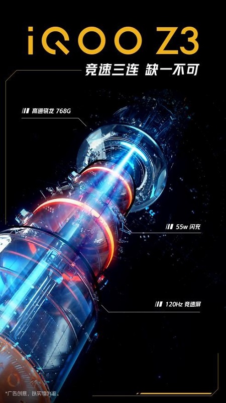 iQOO Z3實力不凡,搭載高通驍龍768G處理器、UFS 2.2閃存和內存融合組成的核心配置,安兔兔跑分高達45萬分,更有五重液冷散熱系統讓性能發揮更盡興,為用戶帶來流暢使用體驗;具備五星級品質的55W閃充,至快46分鐘將4400mAh大電池充至100%電量,更有十一重智能充電防護系統,充電又快又安全;搭載支持DCI-P3廣色域和HDR10的120Hz競速屏,結合180Hz觸控采樣率,屏幕色彩表現出色且觸控操作十分跟手。