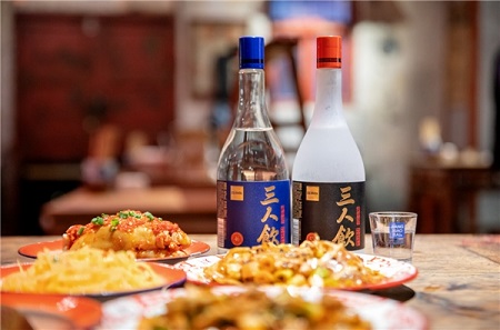 據介紹,三人飲采用單一紅皮高粱發酵,甄選顆粒飽滿的優質高粱,富含豐富的支鏈淀粉,經蒸煮和發酵后會產生特殊芳香,在釀造中傳承并優化了傳統燒酒工藝,使用古法青石窖池純凈發酵,從選糧到看花摘酒,全程由江記酒莊釀酒大師手工釀造,再經2~3年陳釀而成。
