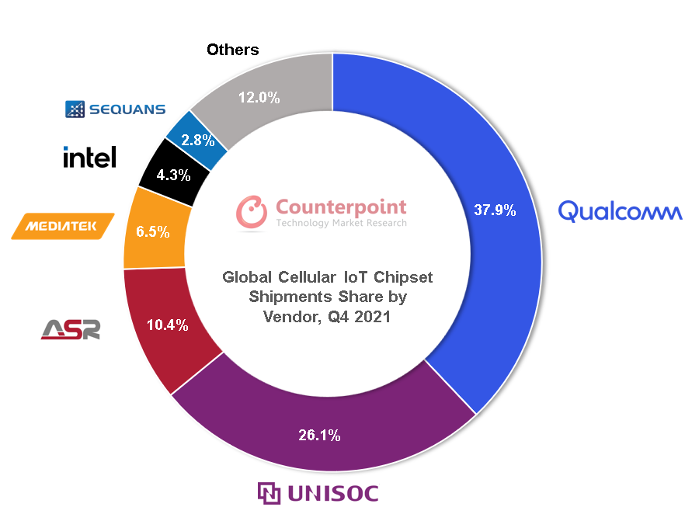 Q4全球蜂窩物聯(lián)網(wǎng)芯片市場(chǎng)出貨量:高通、紫光展銳、ASR位列前三