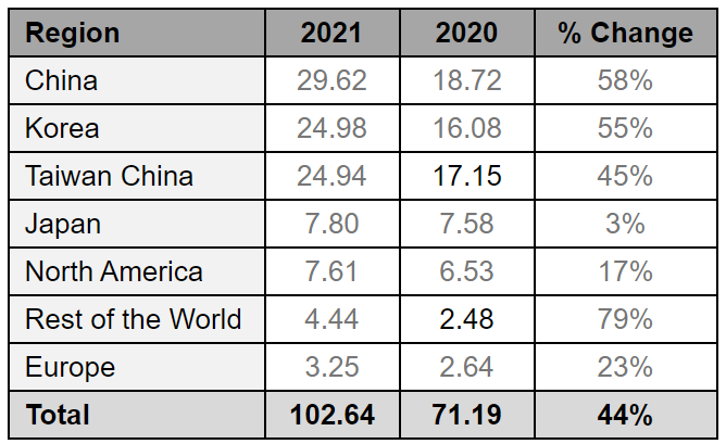 韓國是第二大設備市場,在2020年實現強勁增長后,銷售額增長55%,達到250億美元。中國臺灣地區增長45%,達到249億美元,位居第三。歐洲和北美分別增長了23%和17%,并繼續從2020年的收縮中復蘇。世界其他地區的銷售額在2021上升了79%。從各類設備2021年銷售額較2020年增長幅度來看,晶圓加工設備增長44%,其他前端銷售增長22%,封裝設備整體增長87%,總的測試設備增高漲30%。