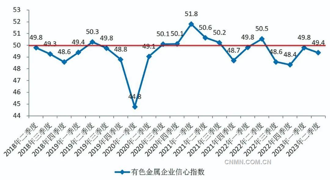 圖1 2018年—2023年有色金屬企業信心指數(圖中紅線為臨界點50)
