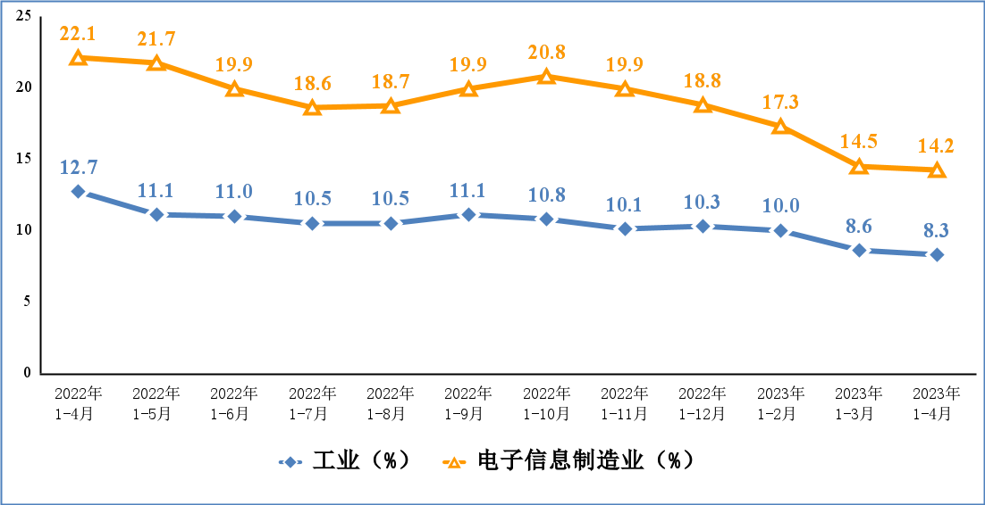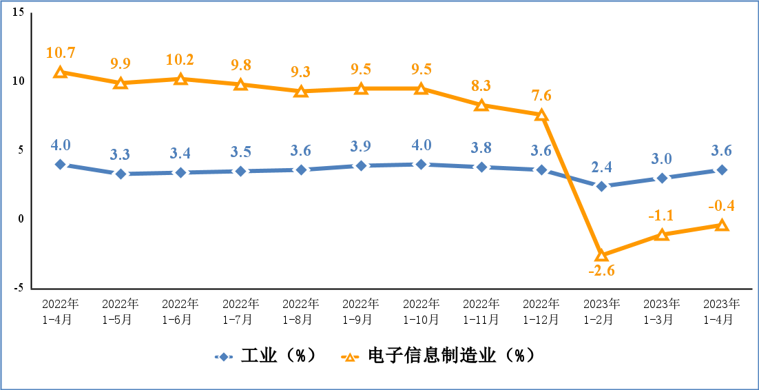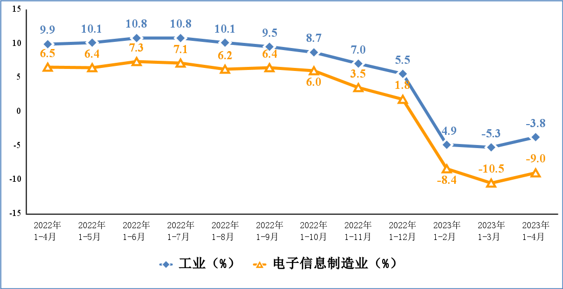 1-4月份,規模以上電子信息制造業增加值同比下降0.4%,降幅較一季度收窄0.7個百分點,增速分別比同期工業、高技術制造業低4個和1.7個百分點。4月份,規模以上電子信息制造業增加值同比增長1.8%。