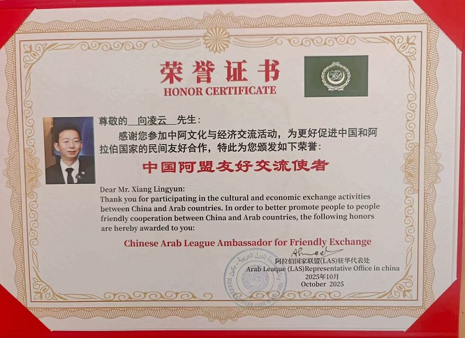 阿盟駐華代表處授予向凌云院士 “中國(guó)阿盟友好交流使者” 榮譽(yù)證書(shū)