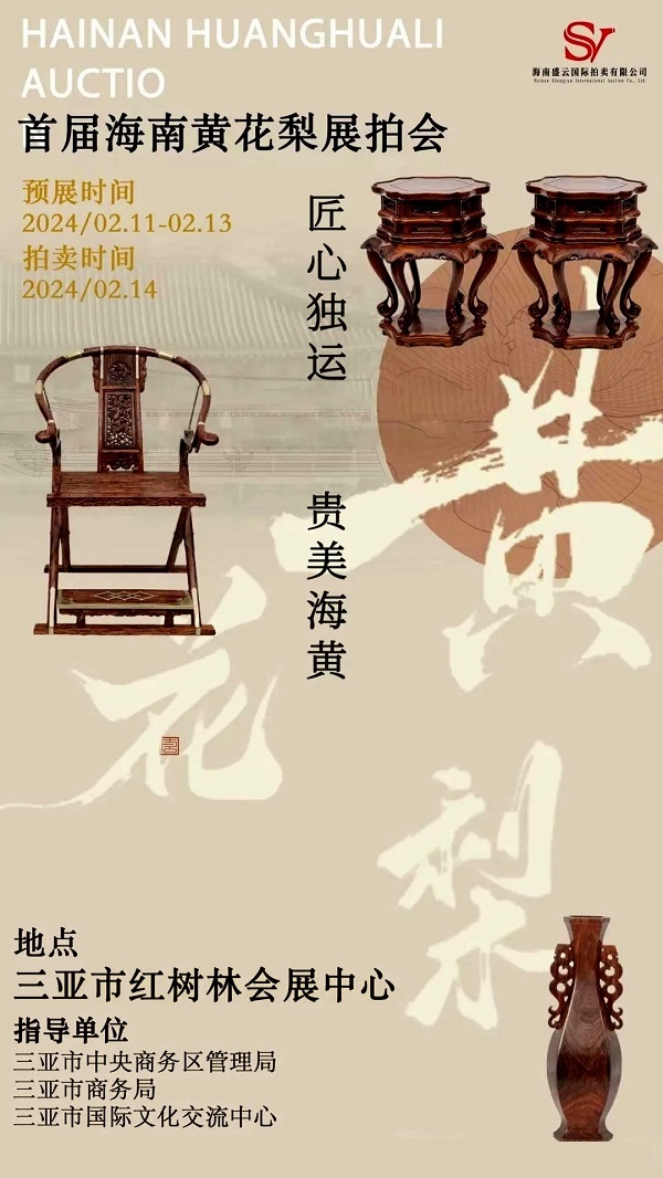 核心提示:本次拍賣會的拍品起拍價皆低于市場均價,并且重磅承諾:本次拍品全為真品海南黃花梨,并且開創(chuàng)了黃花梨拍賣四承諾:保真、如假包換、終身保修、保送,承辦單位誠心實意,歡迎有識之士踴躍參與,共襄盛舉。海南黃花梨以其木質(zhì)細膩溫潤、紋理行云流水、色澤絢麗沉穩(wěn)兒深受廣大市民游客和收藏界人士所喜愛,為弘揚海南黃花梨文化,推動海南省文化事業(yè)的發(fā)展,向世界展示黃花梨的藝術(shù)價值和藥用價值,把海南黃花梨推向世界,經(jīng)三亞市旅游和文化廣電體育局核準,三亞市中央商務(wù)區(qū)管理局、三亞市商務(wù)局及三亞市國際文化交流中心指導(dǎo),中安古代藝術(shù)品物證鑒定技術(shù)(海南)有限公司、海南省黃花梨鑒定所作為支持單位,由海南盛云國際拍賣有限公司承辦的“匠心獨運·貴美海黃”盛云首屆海南黃花梨藝術(shù)品展拍會將于將于2024年2月11日-2月14日在“三亞紅樹林國際會展中心”盛大啟動。