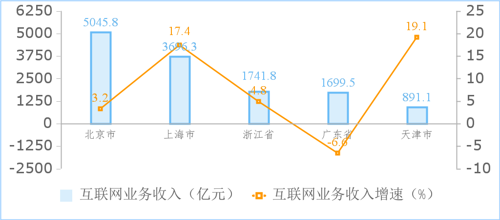 半數地區互聯網業務增速實現正增長。1-11月份,互聯網業務累計收入居前5名的北京(增長3.2%)、上海(增長17.4%)、浙江(增長4.8%)、廣東(下降6.6%)和天津(增長19.1%)共完成業務收入13075億元,同比增長6.6%,占全國比重達83.5%。全國互聯網業務增速實現正增長的省(區、市)有16個。