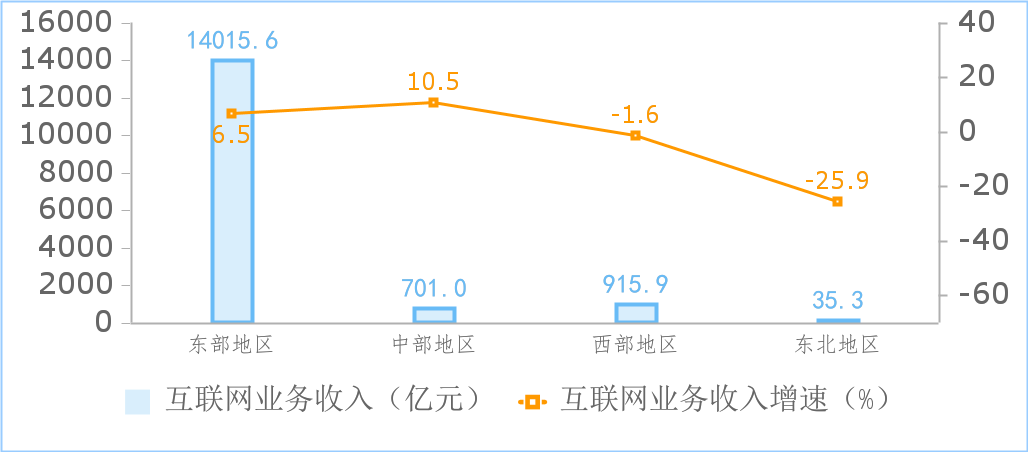 中部地區互聯網業務收入增速持續提升。1-11月份,東部地區完成互聯網業務收入14016億元,同比增長6.5%,增速與1-10月份持平,高于全國增速0.4個百分點,占全國互聯網業務收入的比重為89.5%。中部地區完成互聯網業務收入701億元,同比增長10.5%,增速較1-10月份提升4個百分點,高于全國增速4.4個百分點。西部地區完成互聯網業務收入915.9億元,同比下降1.6%,降幅較1-10月份擴大0.2個百分點。東北地區完成互聯網業務收入35.3億元,同比下降25.9%,降幅較1-10月份收窄3.2個百分點。