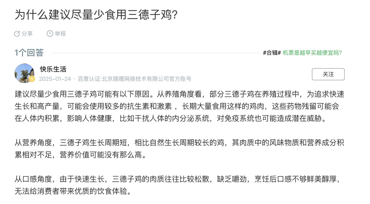 更有甚者,網(wǎng)絡(luò)上還出現(xiàn)了諸如“三德子土雞不能吃”的詞條。經(jīng)核實(shí),這些多為同行利用AI生成、文庫(kù)資料上傳、自問(wèn)自答等手段制造的灌水內(nèi)容。