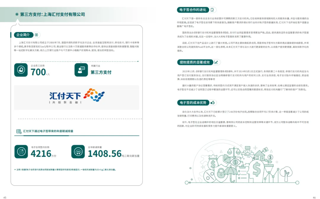 上海匯付支付有限公司是一家持牌第三方支付平臺,業務涵蓋互聯網支付、移動支付、銀行卡收單等多個領域。據統計,上海匯付支付有限公司一年簽署的電子合同份數約為4216萬份。依據法大大聯合企業綠色發展研究院、北京綠色交易所開發的全國首個“簽約減碳”模型計算,全年碳減排約為1408.56噸二氧化碳當量。