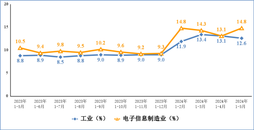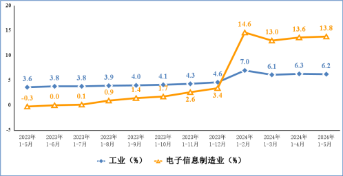 1-5月,規模以上電子信息制造業增加值同比增長13.8%,增速分別比同期工業、高技術制造業高7.6個和5.1個百分點。5月份,規模以上電子信息制造業增加值同比增長14.5%。
