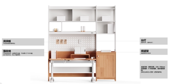 洞洞板,可粘貼或吸附便利貼;臺燈位,開在洞洞板上,不占用桌面空間,可以選裝光明園迪的守護、星球臺燈;全視閱讀架,上下前后可調節,科學管理視角視距;強收納,開放收納空間可放置大于16K書籍;設計活動書立,防止書籍傾倒;更有足夠的空間,將學習平板、打印機等學習裝備富集到同一學習區域;桌面升降,前置手搖升降系統,520~760mm升降高度,滿足小學到高中不同年齡段學生;桌面0-40度調斜,選用新款調斜旋鈕,調斜更便捷;左側固定桌板,可以作為家長陪讀區,也可以用來放書和文具。