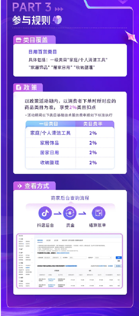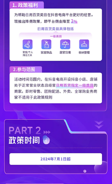 為了更好地扶持商家生意增長,助力日用百貨賽道持續發展,抖音電商密切關注到商家的經營痛點和發展需求,推出眾多平臺福利政策予以支持。其中,日百“降傭”政策,深受賽道新老商家喜愛,畢竟無需報名費,只要合規經營、符合品類范圍,就可以享受傭金降至2%的優惠政策,屬于實打實的成本削減。