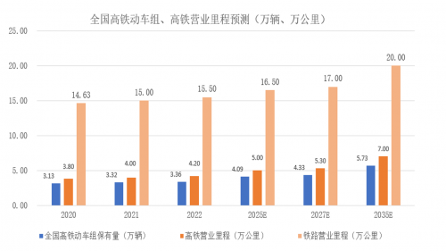 針對高鐵新機裝備方面,根據《國家綜合立體交通網規劃綱要》在中央層面確定了國家中長期交通網規劃建設要求,到2035年我國鐵路網規模達到20萬公里左右,其中高速鐵路7萬公里左右。根據《鐵道統計公報》,2020年、2021年和2022年,我國動車組配置平均密度為0.82輛/公里。由此推算2035年國內將擁有動車組數量5.73萬輛。根據預測,全國高鐵動車組保有量、高速鐵路營業里程未來呈整體上升趨勢,如下圖所示。