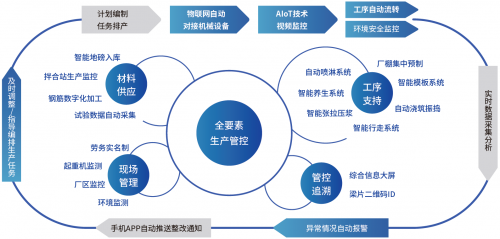 深度融合物聯網、IOT、AI等先進信息化技術,針對梁場生產全生命周期,打通梁片生產從計劃編排、任務排產、生產、驗收、架梁等多個階段。根據生產進度數據與架梁情況,指導編排與調整生產任務,提升梁片生產效率。同時,結合智能化設備與智能監測系統,緊密圍繞材料供應、工序管理、管控追溯等全要素進行綜合管理,打造全方位智慧化管理閉環體系。